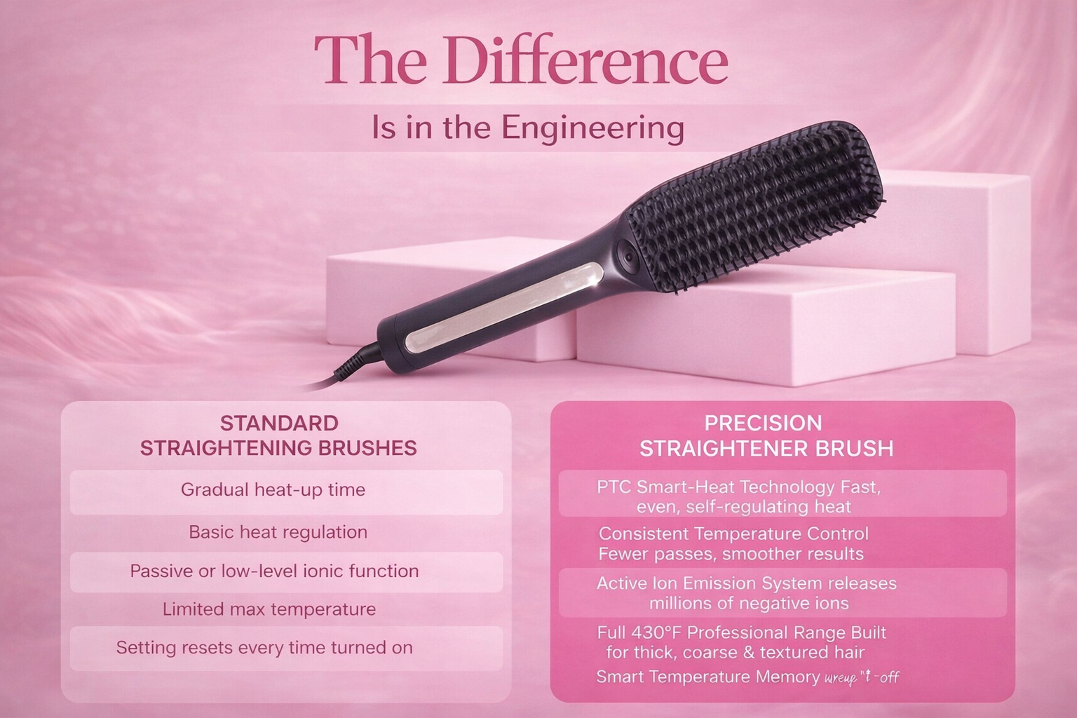 This precision hair straightener brush represents the most advanced straightening technology ever built, combining next-generation heat engineering with intelligent features for salon-grade performance. The revolutionary PTC Smart-Heat Core delivers instant heat and stable temperature control up to 430°F, ensuring fast heat-up with consistent results that require fewer passes through your hair. Unlike standard straightening brushes with gradual heat-up times and basic regulation, this professional tool features memory-save intelligence that automatically starts at your last used temperature, eliminating the need to reset settings every time. The Ion Boost Technology actively releases millions of negative ions on contact, destroying frizz while delivering higher ion output for smoother, shinier hair. The curved root smoother edge is specially designed to reach roots while protecting your scalp, making it ideal for thick, coarse, and textured hair types. Built on the latest technology with a full 430°F professional range, this corded straightener brush offers real-life upgrades that standard brushes simply cannot match. Experience the difference that superior engineering makes in achieving effortlessly sleek, salon-quality results at home in 10 short minutes.
